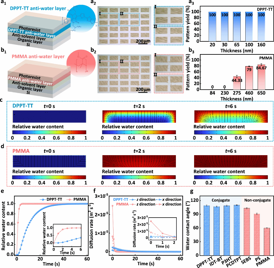 图2. 共轭聚合物的阻水机制:(a, b) 共轭聚合物DPPT-TT和非共轭聚合物PMMA作为抗水层的光刻效果及良品率统计;(c, d) COMSOL模拟水分子在DPPT-TT和PMMA薄膜中的扩散云图;(e, f) DPPT-TT和PMMA薄膜相对水含量及水分子扩散速率随时间变化;(g) 典型共轭和非共轭聚合物薄膜的水接触角。