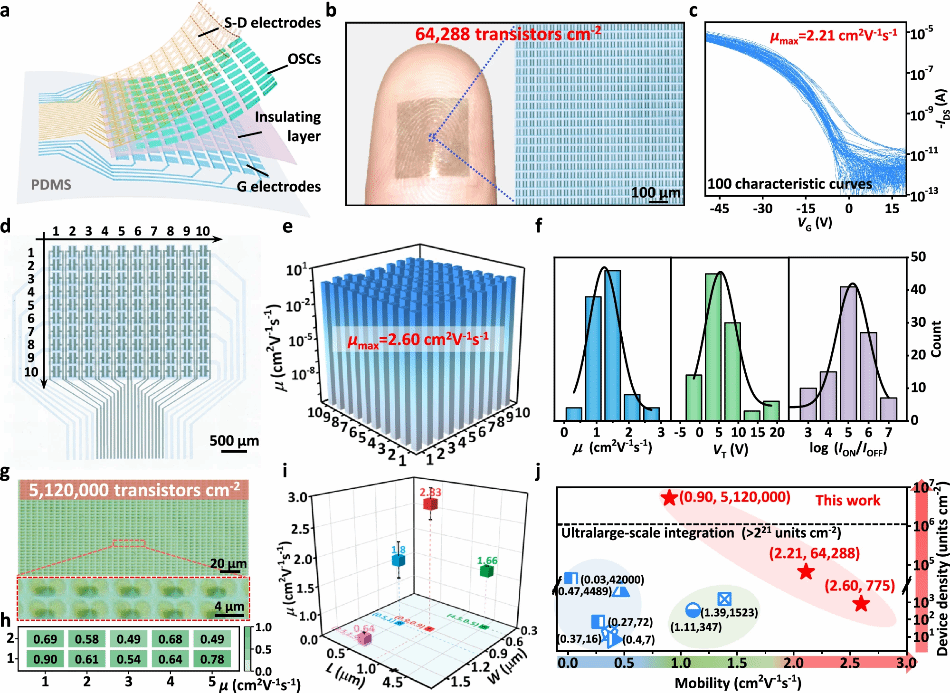 图3. 全光刻柔性OTFT阵列:(a, b, c) 阵列的示意图、显微镜图像及100条器件转移特性曲线(器件密度为64,288个/cm2);(d, e, f) 10×10全光刻柔性OTFT阵列的显微镜图像及各项性能参数统计分布;(g, h) 器件密度为5,120,000个/cm2的OTFT阵列的显微镜图像及器件迁移率;(i) 亚微米OTFT器件的迁移率统计;(j) 文献报道的全光刻柔性OTFT阵列的集成密度及迁移率统计。