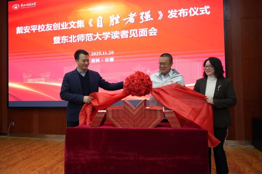 发布仪式上,学校校友工作办公室主任、教育基金会秘书长李亚员致辞。他对戴安平校友重返母校表示欢迎,对其新书出版及长期关心支持母校发展的善举表示祝贺与感谢。他介绍了《自胜者强》一书的创作背景与深切母校情怀,并特别提及他于今年5月捐赠50万元设立“安平教育发展基金”,用于支持学科建设与人才培养。随后,李亚员、物理学院党委书记臧丹与戴安平校友共同为新书发布揭幕。