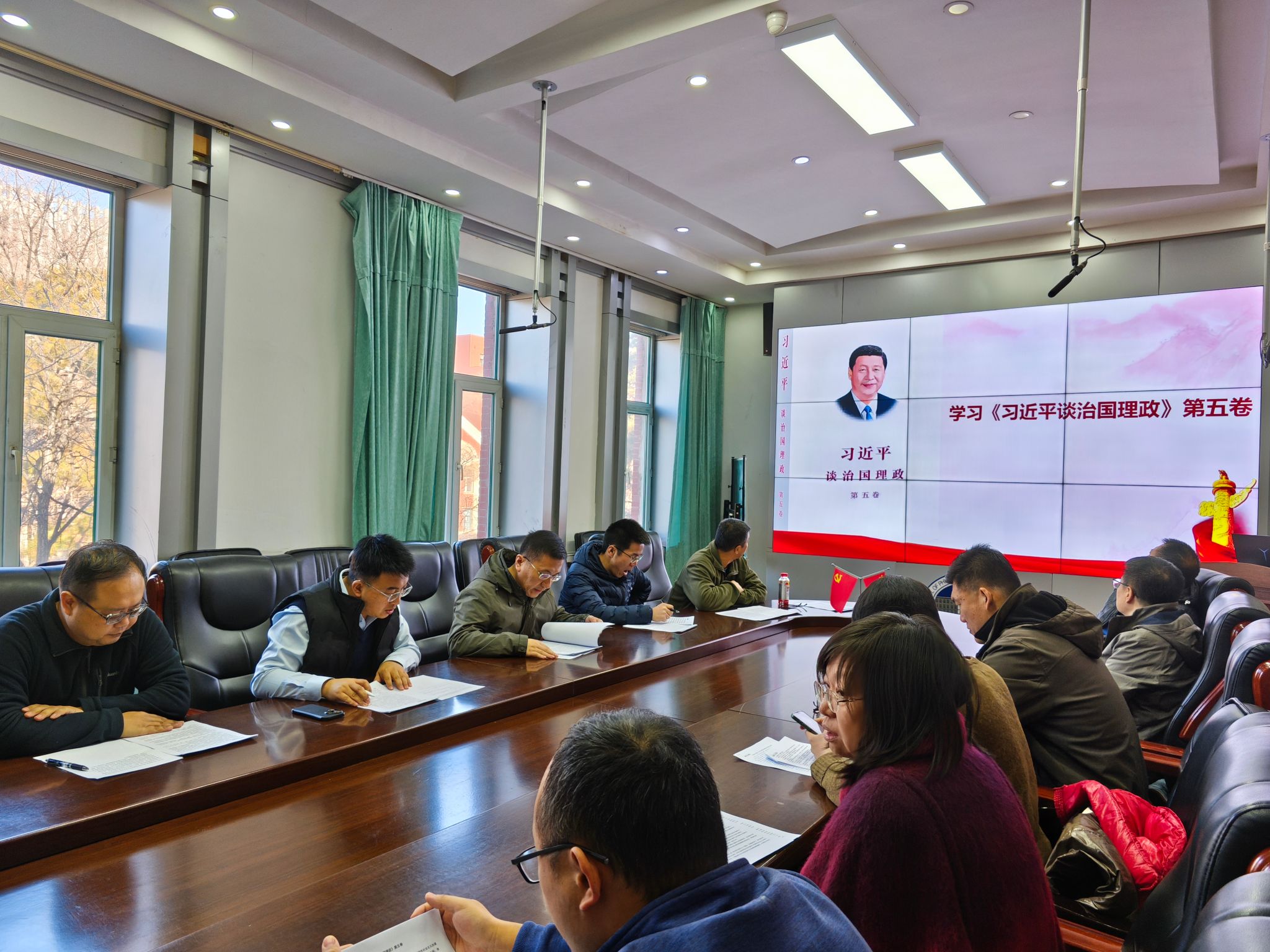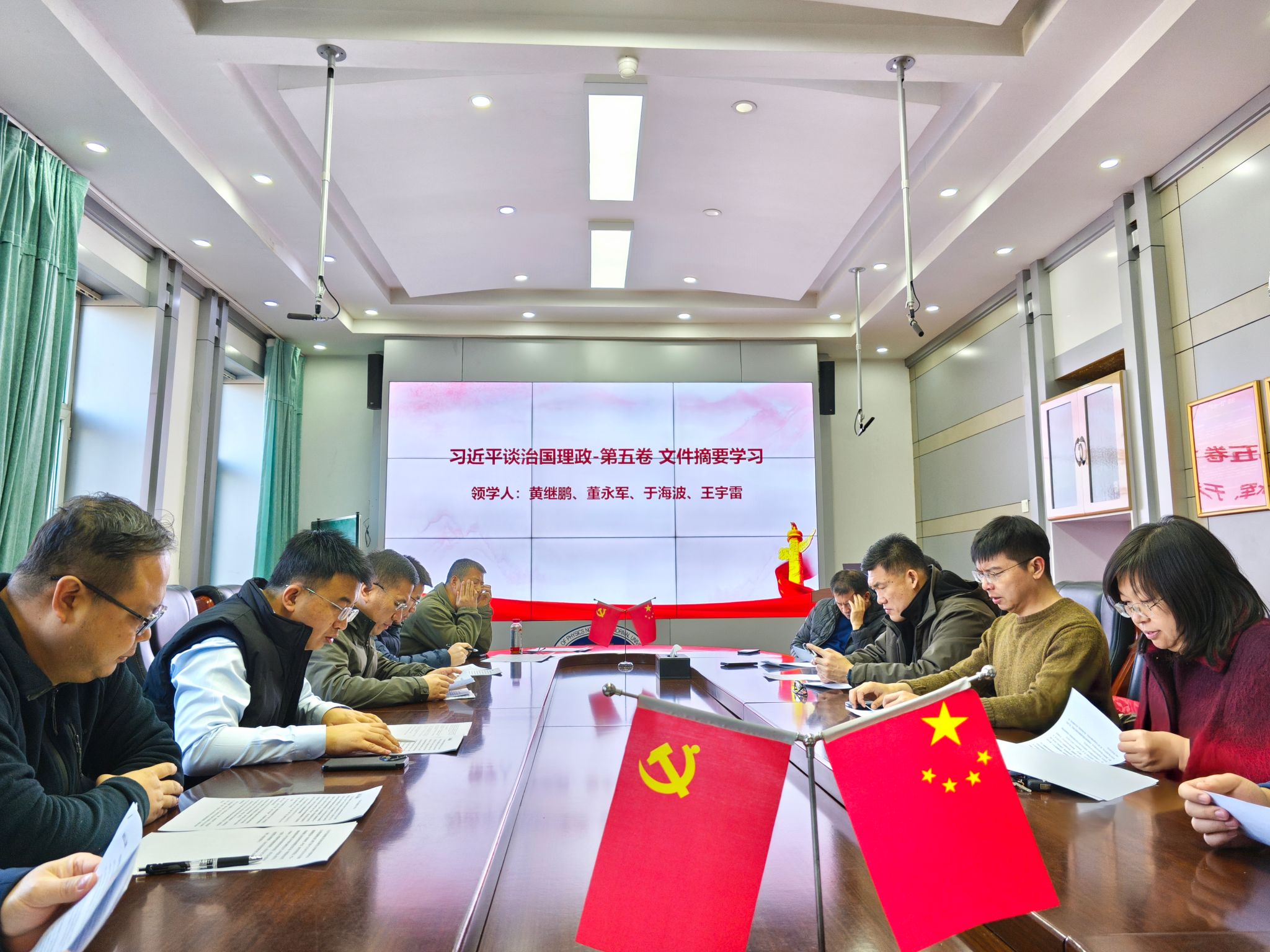 活动第一阶段聚焦《习近平谈治国理政》第五卷学习。按照部署,黄继鹏、董永军、于海波、王宇雷四位领学人依次就著作内容进行领学。黄继鹏同志围绕著作的重要意义展开阐述,指出《习近平谈治国理政》第五卷是全面系统反映习近平新时代中国特色社会主义思想最新成果的权威著作,生动记录了党中央推动全面建设社会主义现代化国家的生动实践,为各项事业发展提供了根本遵循。董永军同志则从整体框架与具体内容两方面进行解读,详细介绍了著作开篇及 18 个专题的划分,深入阐释了中国式现代化的宏伟蓝图、指导思想与实践路径,以及坚持和加强党中央集中统一领导的重要意义。于海波同志重点领学了第五专题 “一体推进教育科技人才事业发展” 中关于加强基础研究、实现高水平科技自立自强的内容,强调基础研究是建设世界科技强国的必由之路,需从强化布局、深化改革、建设平台、培育人才、开展合作、塑造生态等多方面发力。王宇雷同志则分享了激发各类人才创新活力和潜力、以教育之强夯实国家富强之基等相关论述,为支部在教育教学与人才培养方面提供了明确指引。