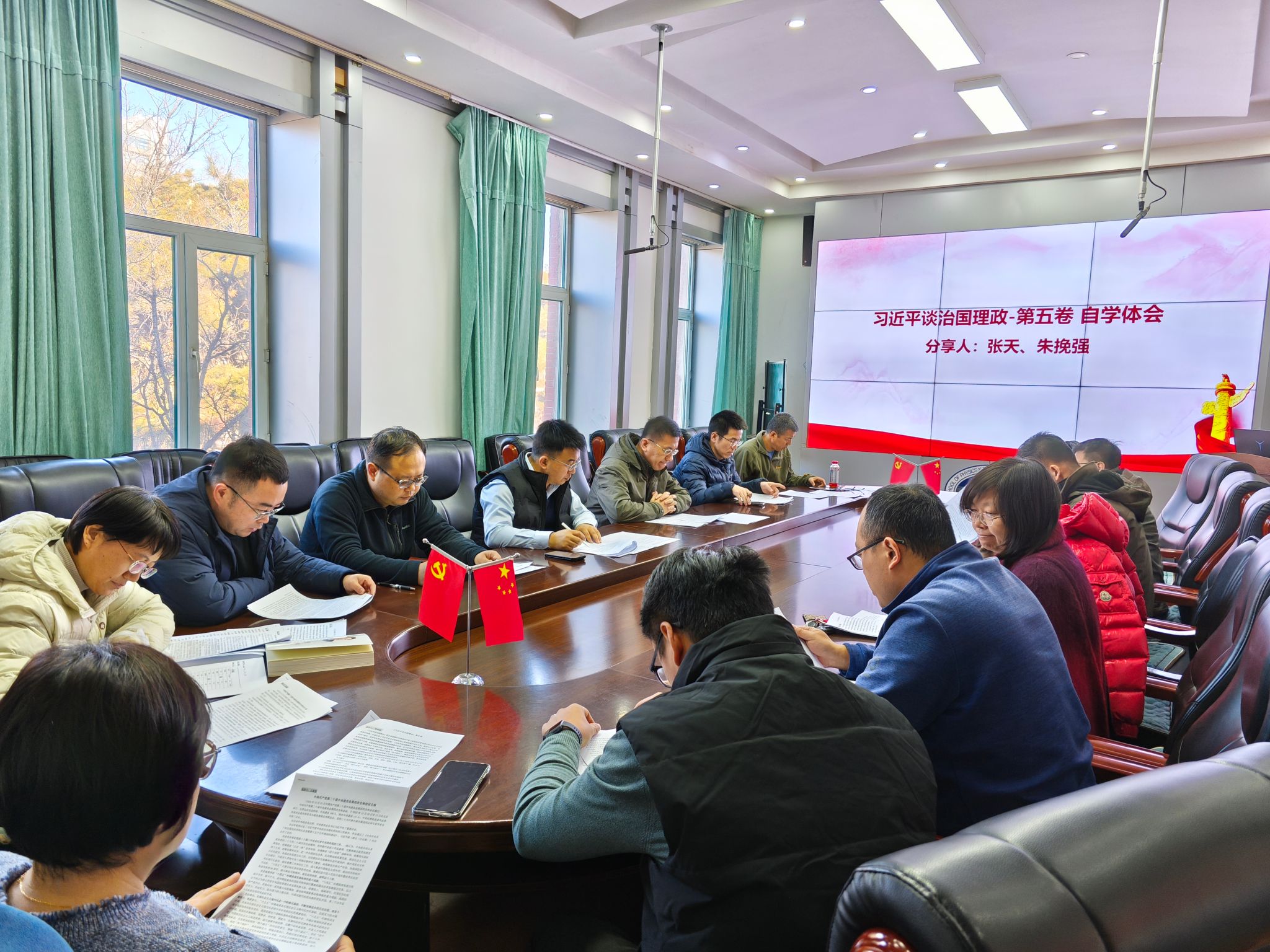 领学结束后,进入自学体会分享环节。张天、朱挽强两位同志结合自身提前自学的感悟进行发言。张天同志谈到,通过深入学习《习近平谈治国理政》第五卷,更加深刻认识到教育科技人才对于国家发展的重要性,作为应用物理领域的教育工作者,将把书中的理论精髓融入课堂教学,注重培养电子信息学生的创新思维与实践能力。朱挽强同志表示,著作中关于科技自立自强的论述让自己备受鼓舞,在后续的科研工作中,将聚焦应用物理-海洋能领域的关键技术问题,扩大国际交流,努力实现新突破,为推动高质量发展贡献力量。
