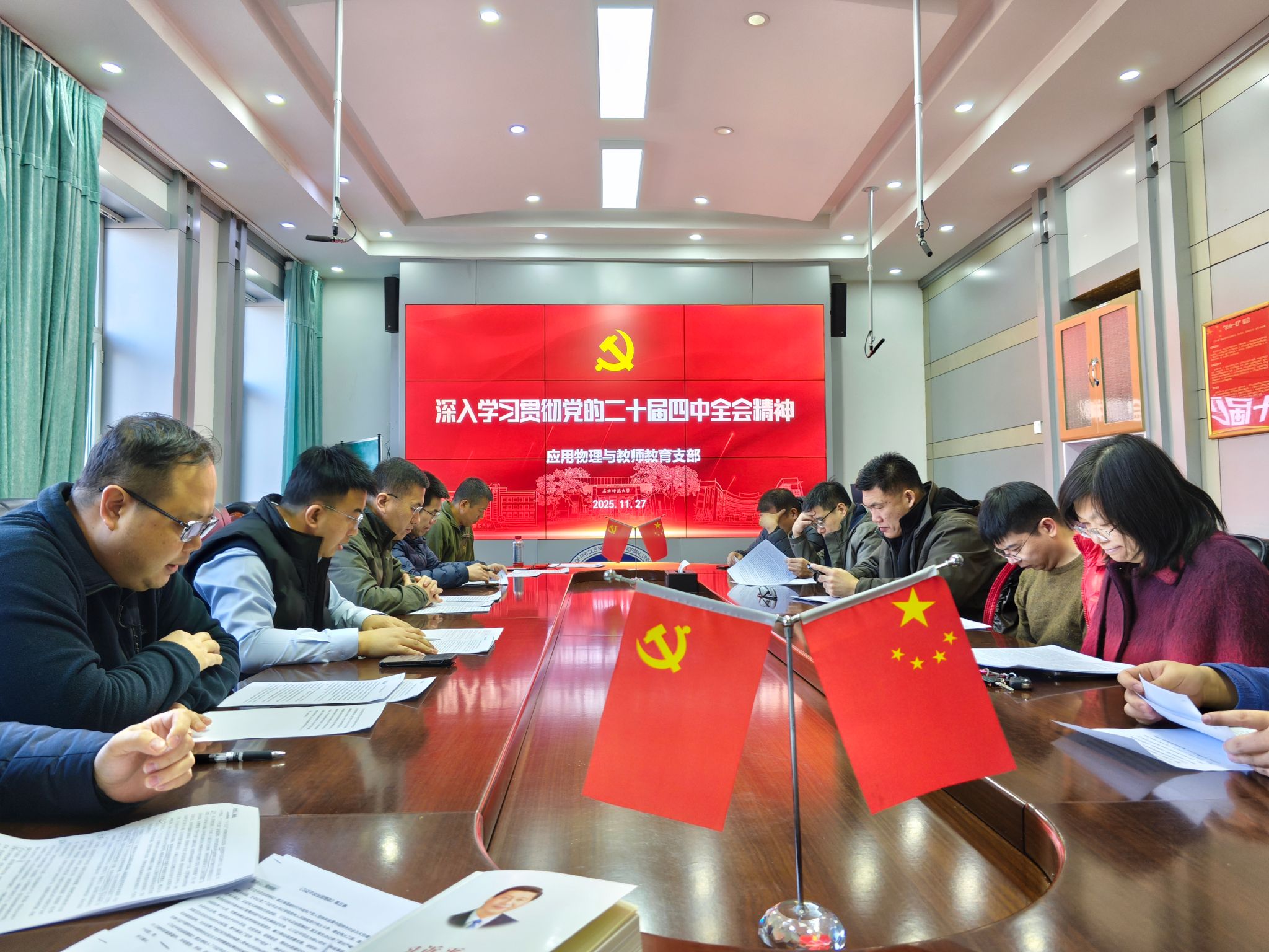 11 月 27 日,应用物理与物理教师教育党支部在学院会议室举办 “深入学习《习近平谈治国理政》第五卷、贯彻党的二十届四中全会精神” 主题党日活动。党委委员付申成教授莅临指导党务工作,党支部全体党员参与活动,党支部书记黄继鹏主持会议。此次党日活动旨在将党的理论学习与物理教育教学、科研实践深度融合,凝聚支部力量助力教育强国与科技强国建设。