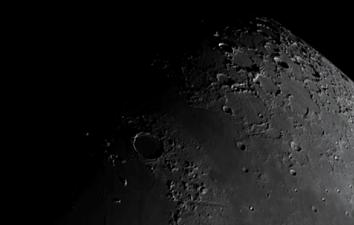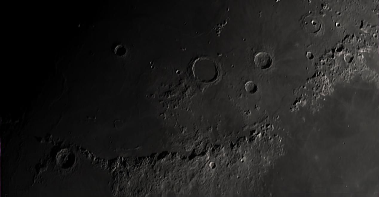这张月球影像观测目标聚焦月球北半球两大标志性地貌单元——柏拉图环形山与高加索-亚平宁山脉。观测设备采用8寸施密特-卡塞格林式望远镜搭配QHY715C行星相机,通过施卡结构的2000mm长焦与IMX715传感器的小靶面获取月面细节,利用赤道仪月亮速完成目标跟踪,将相机参数设为16bit、保证30帧/秒帧率、全分辨率4K成像,最终使用Autostakkert!4软件对3000张单帧影像进行叠加处理,有效抑制大气抖动与设备噪声,获得具备分析价值的信噪比。