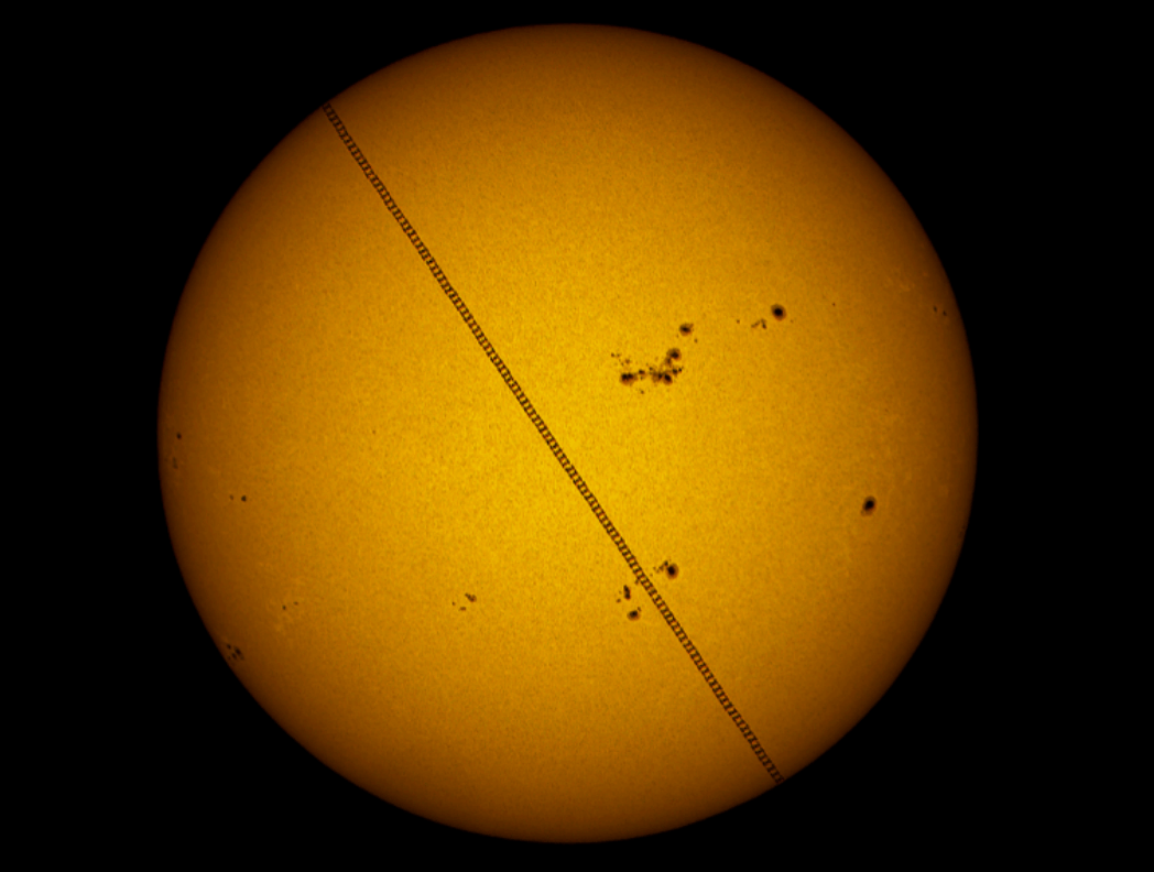 本次观测的一大亮点的是,国际空间站恰好凌过太阳表面的一个活跃黑子群,而观测时段恰逢太阳黑子活跃度极高的时期。作为G型主序星,太阳直径约139万公里,占据太阳系总质量的99.86%,其1500万℃的核心通过氢核聚变供能,能量最终传递至温度约5777K的光球层——太阳黑子(3000–4500 K的强磁性低温区域)便出现在这一层上。这些借助专业设备可清晰观测的黑子,成为了追踪国际空间站凌日轨迹的地标,让此次凌日兼具科研价值与视觉冲击力。