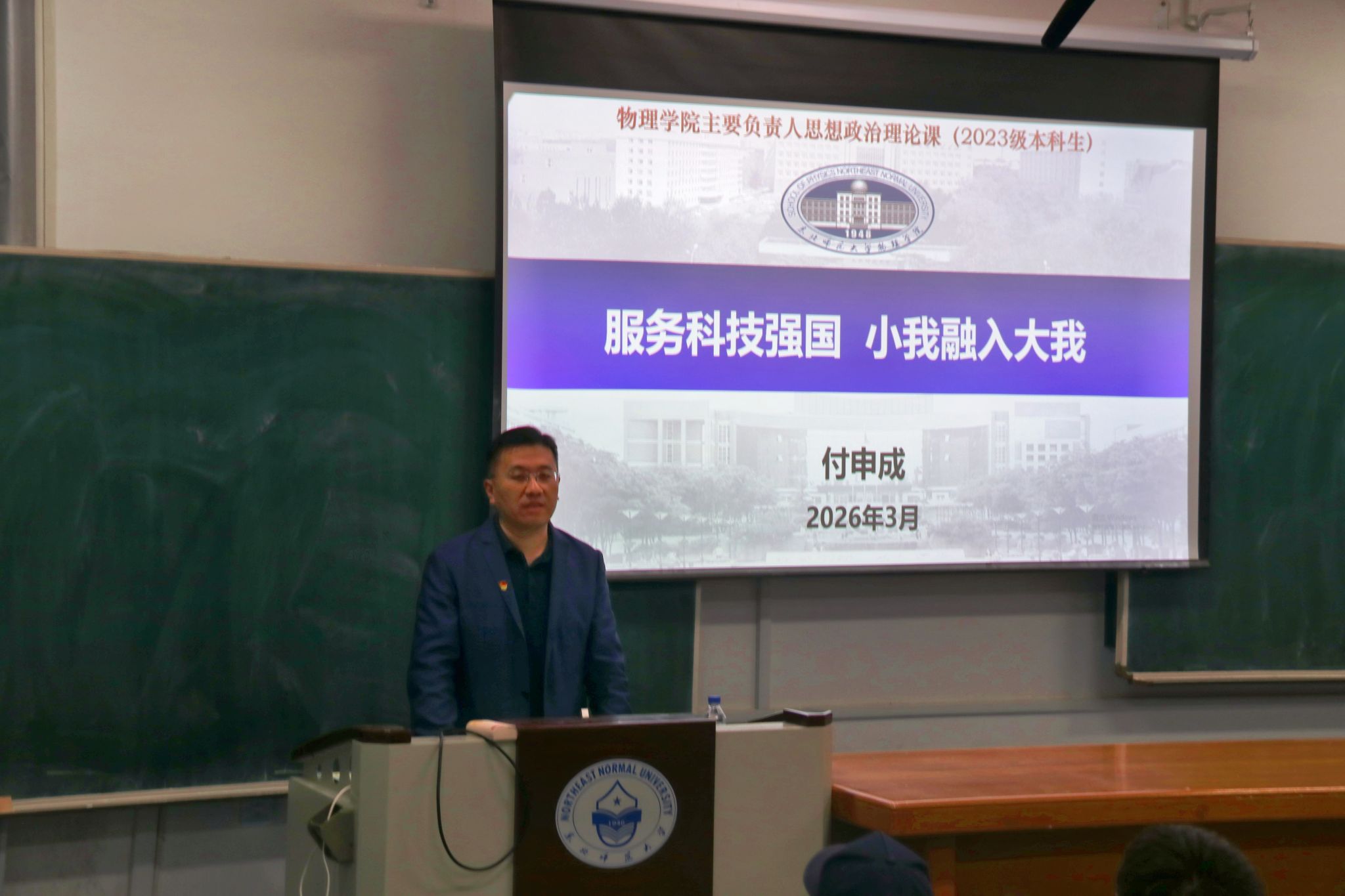 为深化思想政治理论课建设,引导青年学子将个人理想融入国家发展大局,2026年3月26日,物理学院院长付申成教授在学院101教室为2023级本科生讲授思政课,2023级辅导员阿卜拉江及130余名本科生参加课程。