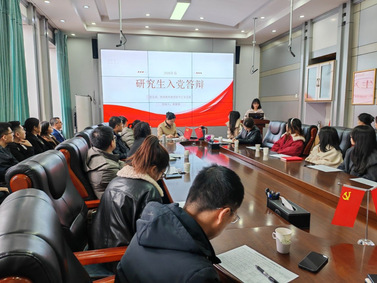 为严格规范党员发展程序,切实提升党员发展质量,物理学院党委于4月1日上午在学院会议室组织召开了“2026年春季学期研究生入党答辩暨发展对象预审会议”。会议以入党答辩与集体预审相结合的方式,对研究生入党积极分子的政治素质、学业科研、现实表现等进行全面评议与审查。学院党委委员、团委书记、辅导员、各研究生党支部书记及支部委员代表参加会议。