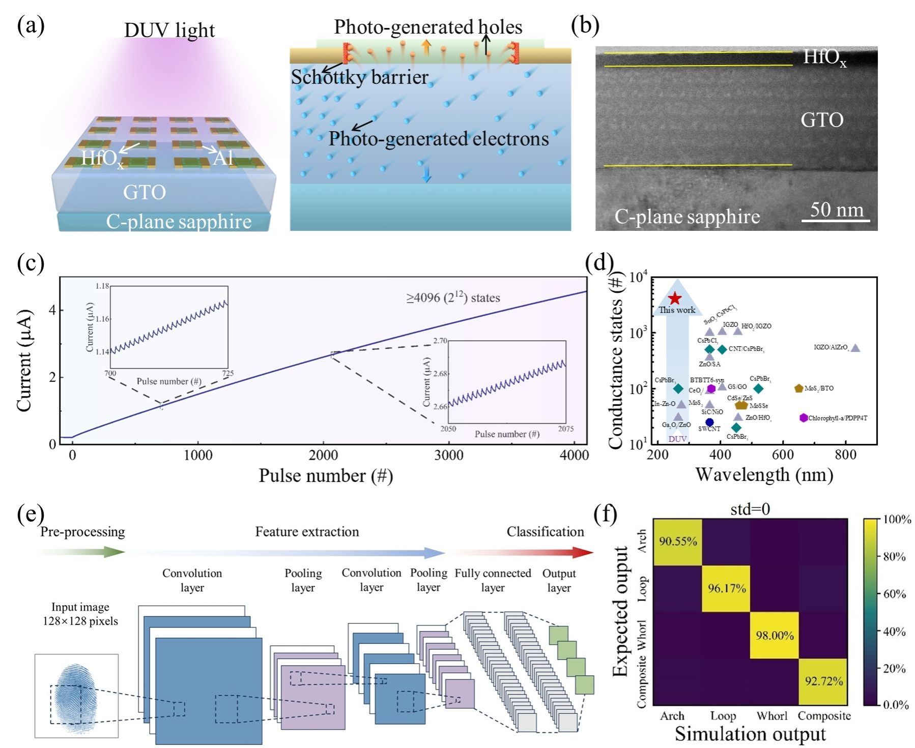 团队设计出级联异质结基氧化镓光电忆阻器,通过异质结内置电场分离电子-空穴对,并利用Al/HfOₓ肖特基势垒捕获空穴实现增益效应,在完成4096(212)个电阻状态精确调控的同时保持较高的线性度;以此为基础构建深紫外神经形态视觉系统,实现了不同指纹类型的精确分类。相关成果以“Ultra-Highly Linear Ga2O3-based Cascade Heterojunctions Optoelectronic Synapse with Thousands of Conductance States for Neuromorphic Visual System” 为题,发表在国际期刊Light: Science & Applications《光:科学与应用》上,李鹏副教授和单旋宇博士后为共同第一作者,林亚副教授、王中强教授和徐海阳教授为通讯作者。