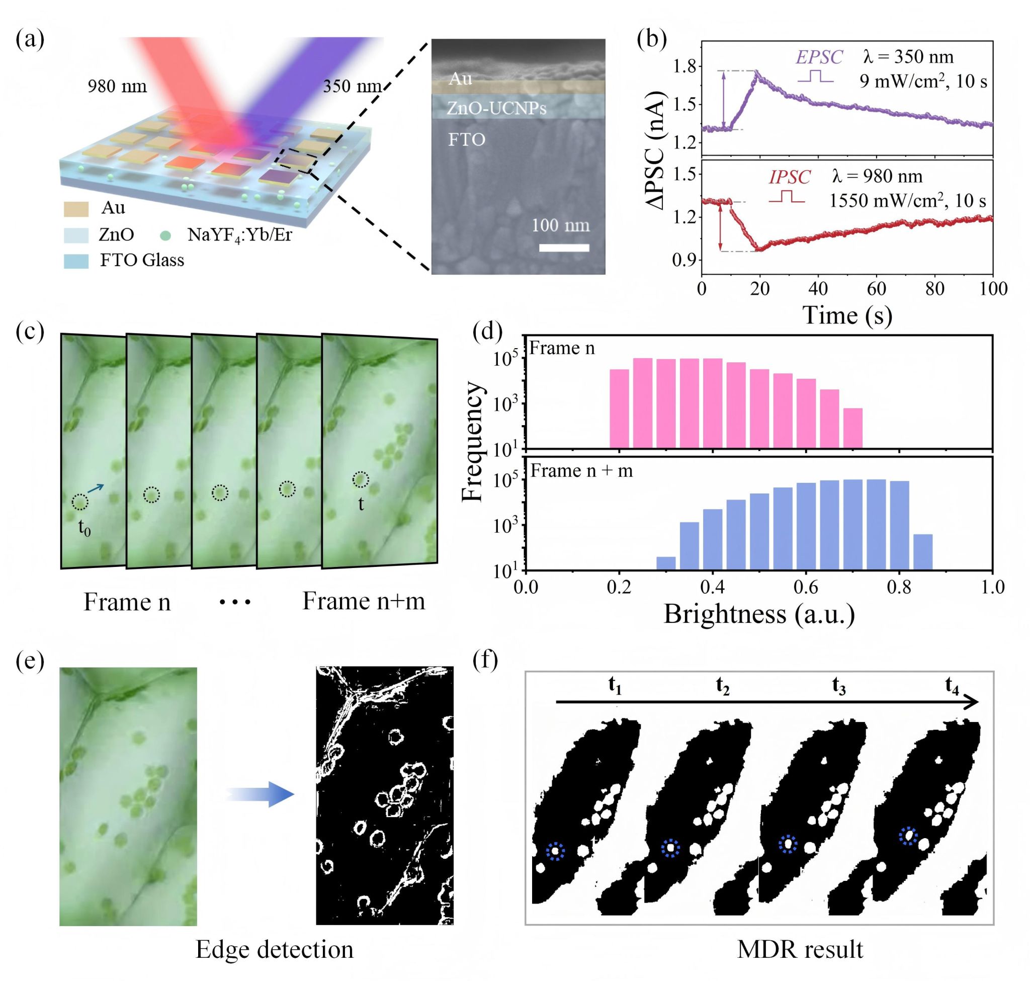 图1. 近红外全光调制光电忆阻器及微观生物运动的边缘提取与运动识别功能